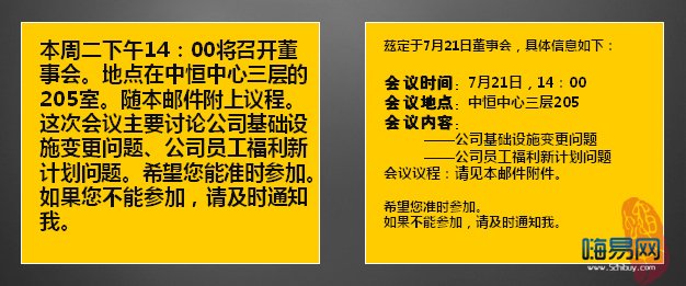這也是一個提煉文本信息的例子,也是何老師經(jīng)常使用的例子。這是封郵件,5秒中之內(nèi)那個你能記住的信息更多?結(jié)果不言而喻,所以以后無論是寫郵件,或單純的Word排版都應稍微注意一下,這方面何老師可是專家,大家可以像她多多學習。