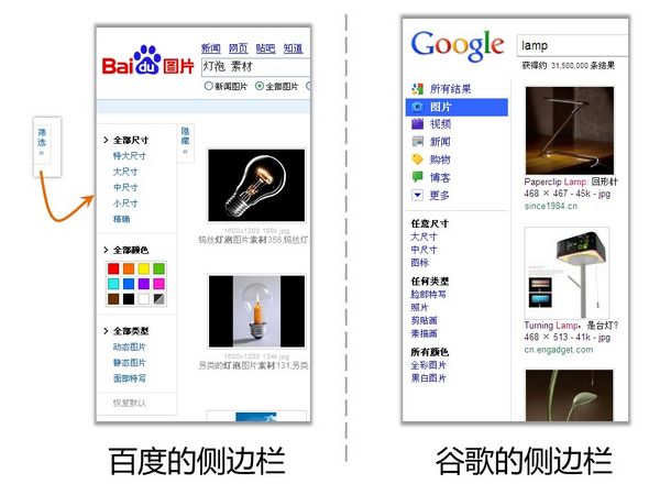 除此之外,為了改善圖片的搜索質(zhì)量,百度和谷歌都有改善的側(cè)邊欄。其中百度是在搜索結(jié)果頁(yè)面的左側(cè),有個(gè)“篩選”文本框,點(diǎn)開(kāi)之后即為篩選選項(xiàng)欄;而谷歌則也搜索結(jié)果頁(yè)面的左側(cè)直接展開(kāi)該選項(xiàng)欄。如圖3所示。