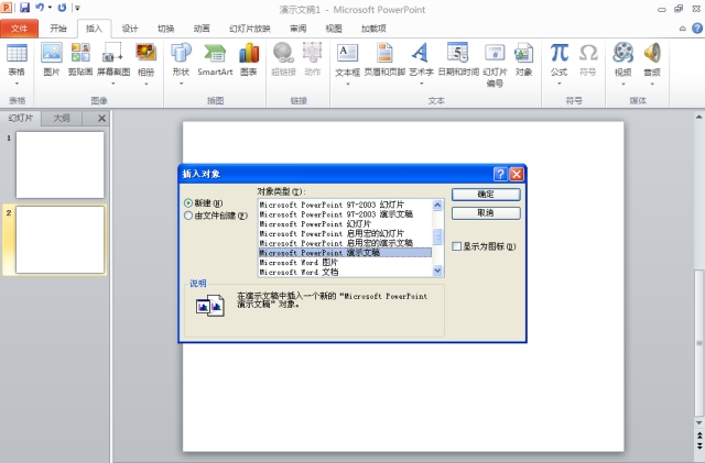 先打開PowerPoint 2010,來到要制作縮略圖效果的空白幻燈片頁面,然后依次單擊“插入→對象”,打開“插入對象”對話框,單擊“新建”,在對象類型中選擇“Microsoft PowerPoint演示文稿”,單擊“確定”按鈕(圖1),在該幻燈片頁面中插入一個新的演示文稿。
