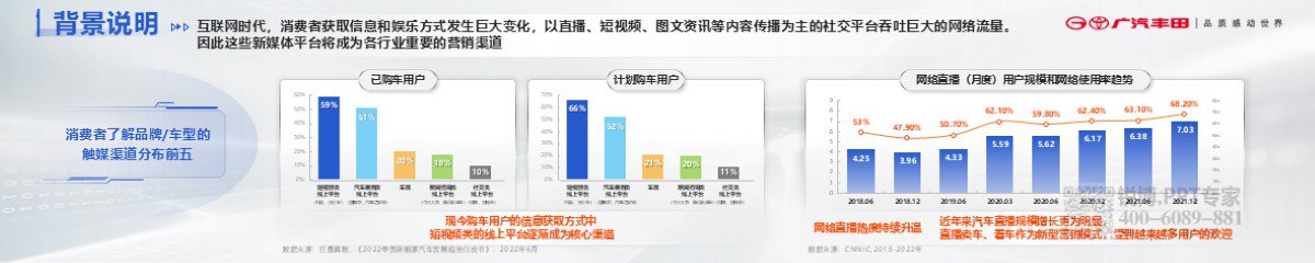 背景元素為簡潔的線條、光影圖案,增添科技氛圍,汽車圖片突出主題,整體設計清晰傳達新媒體營銷體制探索的背景及相關數據信息。
