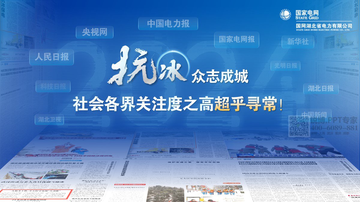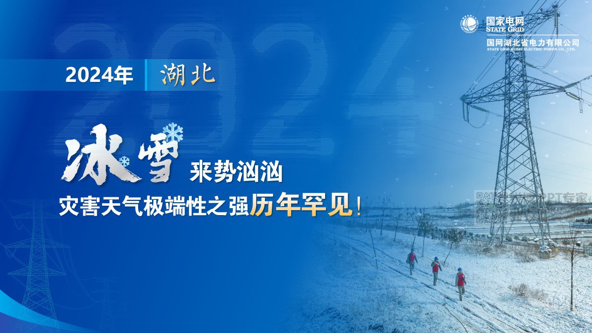 PPT標題 “冰” 字藍色、“火” 字橙色,冷暖對比強烈,既展現冰天雪地與火熱工作激情的碰撞,又吸引視覺,傳達國網湖北電力不畏艱難、守護電力的精神。