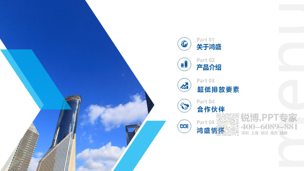 ——說(shuō)明:鴻盛集團(tuán)采用了兩種深淺不一的藍(lán)色為主色調(diào),深藍(lán)色代表著權(quán)威、穩(wěn)定,淺藍(lán)跟天空的顏色相識(shí)代表著永恒·。藍(lán)色的清新視覺(jué)感受與企業(yè)從事綠色排放的業(yè)務(wù)相符,打造出了簡(jiǎn)潔高端的藍(lán)白商務(wù)風(fēng)格設(shè)計(jì)。平行式與垂直式的排版方式符合人們的閱讀習(xí)慣,對(duì)文字起到分欄作用的同時(shí)看上去簡(jiǎn)約大方,一目了然、重點(diǎn)突出。