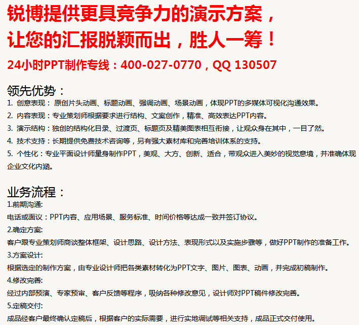 銳博的PPT設(shè)計(jì)、PPT制作、幻燈片制作擁有百分之百的著作權(quán),在PPT專門設(shè)計(jì)制作領(lǐng)域扎根深厚,我們的幻燈片設(shè)計(jì)服務(wù)深圳、廣州、長(zhǎng)沙、合肥、南昌等中國(guó)區(qū)域,我們致力為客戶提供膠片級(jí)別的幻燈片設(shè)計(jì)服務(wù),并創(chuàng)建PPT匯報(bào)的完整生態(tài)體系。