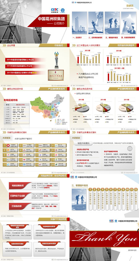 中國葛洲壩集團公司是中國水利水電施工企業(yè),具有工程施工總承包特級資質(zhì)現(xiàn)已上市。內(nèi)容方面銳博PPT從葛洲壩集團的企業(yè)簡介、近年營業(yè)收入情況、品質(zhì)升級情況、及市場分析等方面對葛洲壩集團做了詳細介紹,設計方面銳博以淡黃色打底數(shù)據(jù)分析采用樹狀圖對比展示,視覺效果十分清晰。