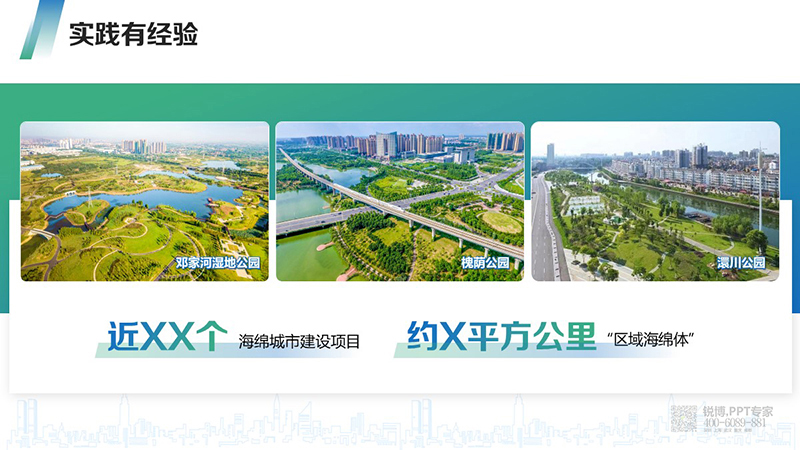 PPT整體采用藍(lán)綠漸變的色調(diào),搭配白底,版面清新自然,讓人聯(lián)想到自然、水,貼合PPT水環(huán)境、水生態(tài)、